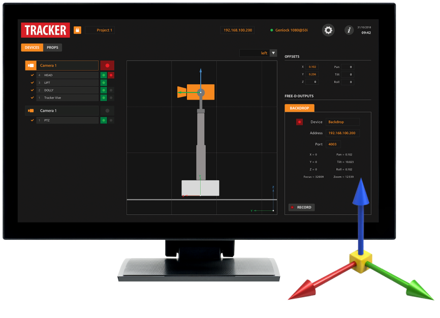Comme ils peuvent être combinés en un «objet caméra», TRACKER gère l’agrégation des signaux pour fournir une seule données FreeD au moteur de production virtuelle. FreeD est un standard interprété par les solutions les plus répandues : Zero Density, Pixotope, VizRT, Avid, Backdrop, disguise, …